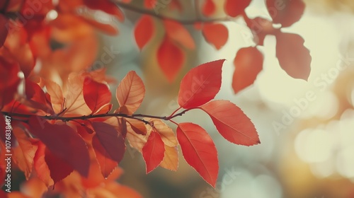 Red autumn leaves backlit during sunset with soft bokeh background, copy space