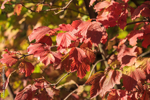 Red autumn leaves on a branch on a bright sunny day