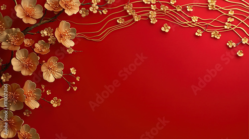 Red background, golden decoration and Chinese New Year elements on the right side of red paper with floral pattern