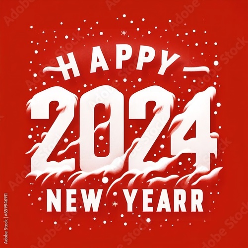 Red background It has Happy New Year 2024 letters, white with snow on it. in the center of the picture Snow falls on the ground below.