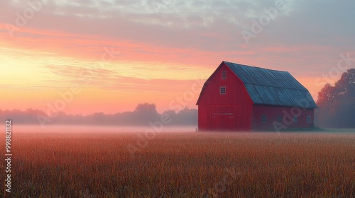 Red Barn in a Foggy Field at Sunrise