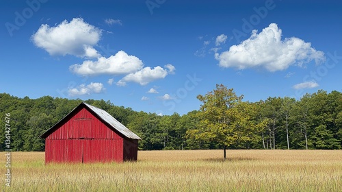 Red Barn in a Golden Field under a Summer Sky: A Peaceful Countryside Landscape