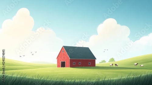 Red barn in a vibrant green field with cows and birds on a sunny day