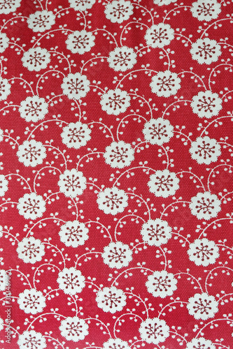 red beautiful Asian style background with small white flowers, textile texture background decorated with white print pattern in red color, seamless flower pattern design on red hot background