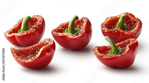 Red bell pepper halves, seasoned, studio shot, isolated on white