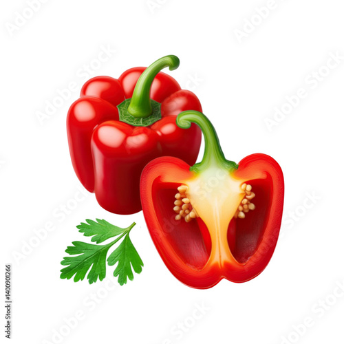 Red bell pepper with half slice and green coriander leaf on transparent background