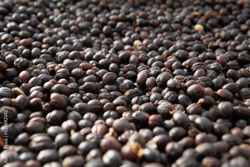 Red berries raw coffee beans with shell in water process to sort out the quality berries to preparing for coffee roaster in factory