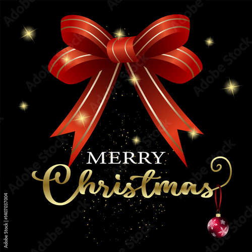 Red bow and Christmas text.Vector illustration with red bow and Christmas text on black background with decor.