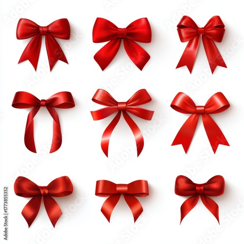 Red bows in various styles. Perfect for gifts and celebrations, the ribbons add a touch of elegance