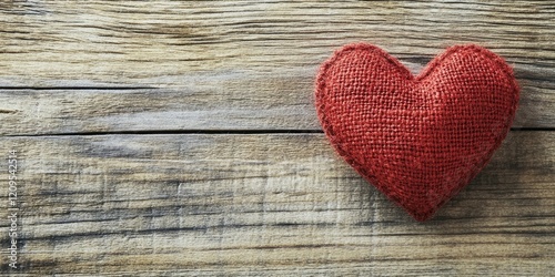 Red burlap heart placed on a rustic wooden desk with ample empty space on the left for personalized text ideal for Valentine's Day cards