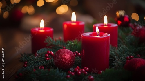 Red candles illuminate festive decorations with greenery and ornaments during a holiday gathering