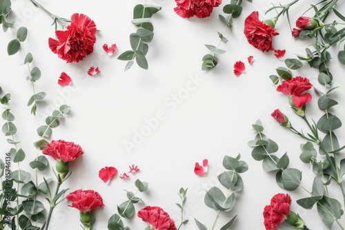 Red carnations and eucalyptus leaves arranged on a white background, creating a vibrant floral frame
