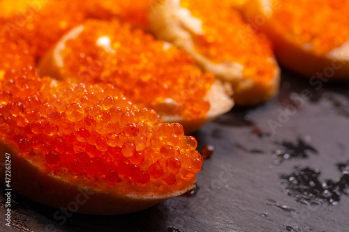 Red caviar on a bread slice on a black stone serving plate. Bread with butter. Sandwiches with caviar. Russian caviar.