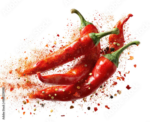 Red chili peppers explode in a spicy mix of herbs and spices
