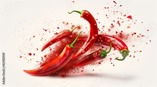 Red Chili Peppers Exploding With Flying Spice Powder And Broken Pieces Isolated On White Background Highlighting Fiery Heat, Flavor And Seasoning