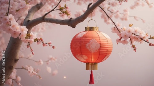 Red Chinese lantern hanging from a cherry blossom branch against a soft pink sky. Ideal for Lunar New Year, spring festival, culture, or romantic background use.