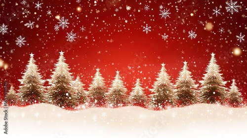 Red Christmas Background with Snow - covered Pine Trees and Falling Snowflakes