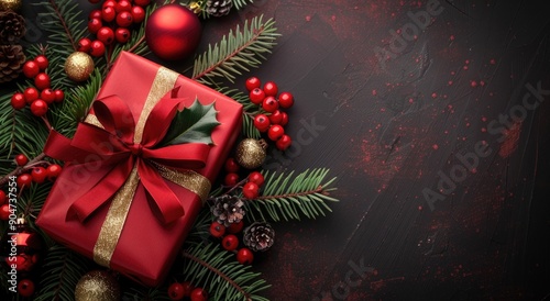 Red christmas gift box on dark background