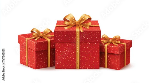 Red christmas gift boxes with shiny gold ribbons on transparent background, festive holiday presents for celebration, decoration, and seasonal packaging