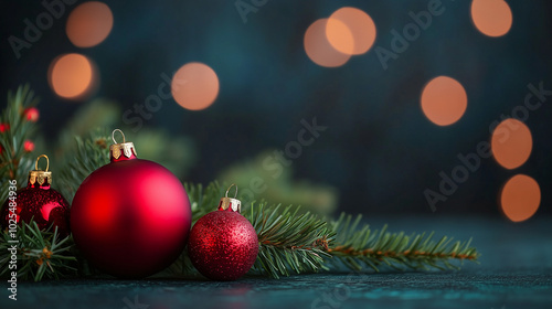 Red Christmas ornaments are elegantly placed on a pine branch, complemented by a soft, bokeh background that enhances the festive mood of the setting, copy space