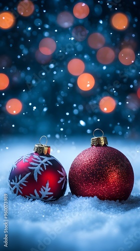 Red Christmas Ornaments in Snow with Bokeh Lights
