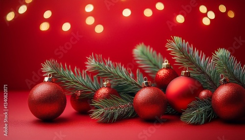 red christmas ornaments with evergreen branches and lights on red background