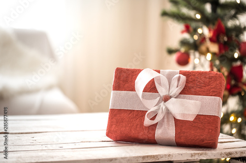 Red Christmas present over Christmas lights and Christmas tree on light background on cozy rug. Christmas decorations