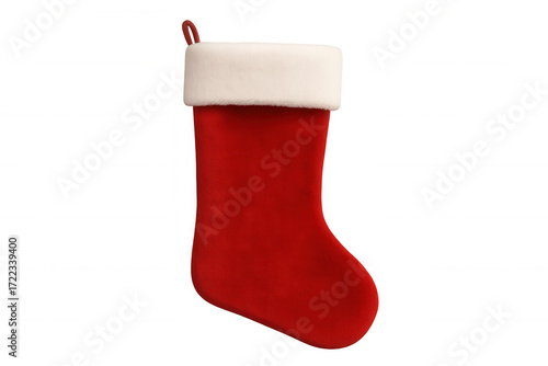 Red christmas stocking with white cuff and hang loop, holiday tradition and festive decoration, isolated with transparent background