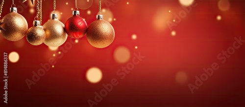 Red Christmas tree branch with ornaments and bells on a background Plenty of space for adding text or images. Copyspace image