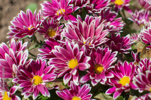 red chrysanthemums in a flower bed in the sun