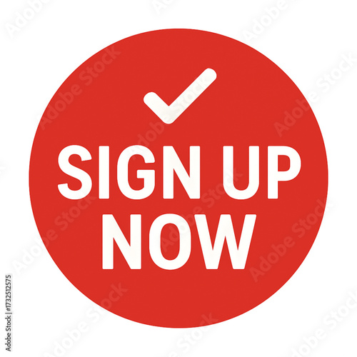 Red circular button with bold white checkmark and text "SIGN UP NOW". Clean, modern call-to-action design for websites, apps, marketing, banners, UI, promotions, and digital campaigns.