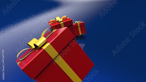 Red closed gift boxes with yellow ribbon on dark blue background. 3D illustration. 3D CG. 3D high quality rendering.