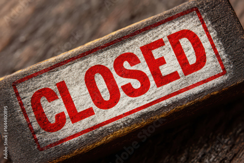 Red closed sign on a weathered wooden block with a distressed and rustic appearance close up view