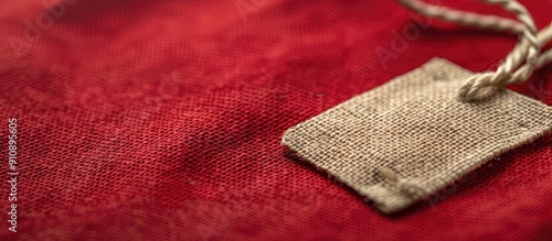 Red cotton shirt fabric with white clothing tag label on a copy space image