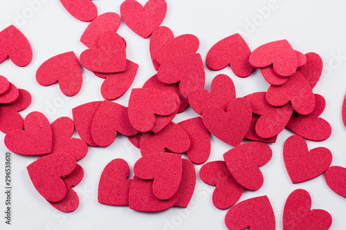 Red crafting foam hearts in white background. Decor hearts by cutting from red crafting foam