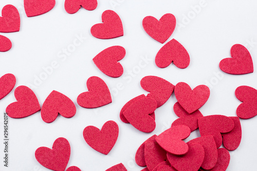 Red crafting foam hearts in white background. Decor hearts by cutting from red crafting foam