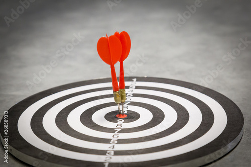 Red dart arrow hitting in the target center of dartboard on bullseye with sun light vintage style, Target marketing and business success concept - Image.