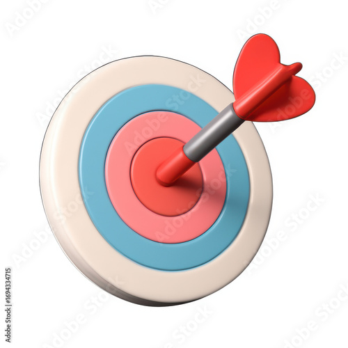 Red dart precisely hits center bullseye of target game symbolizing success and achievement white background