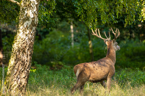 Red deer in a forest during rutting season.