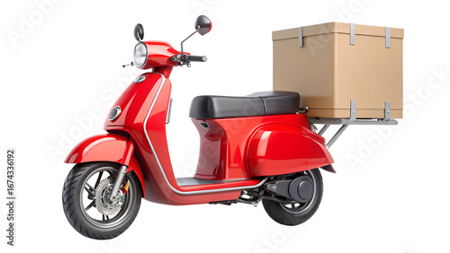 Red delivery scooter with box isolated on transparent background for urban transportation and retro vintage style design