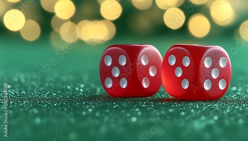 Red dice on green glitter background
