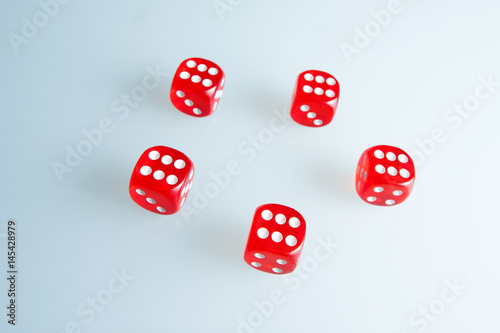 Red dice on the glass. Five dice with the value of "six". Successful throw. Five red dice are on the table