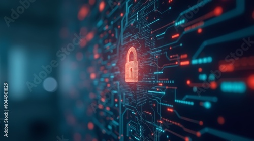 Red digital padlock symbol on a futuristic circuit background representing data security