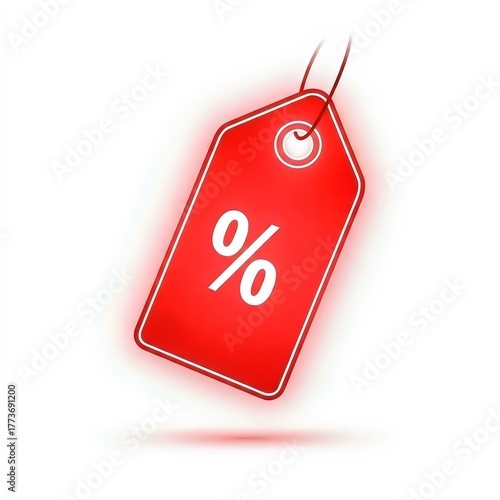 Red discount tag with percentage sign glowing vector illustration for sales promotions isolated on white background.
