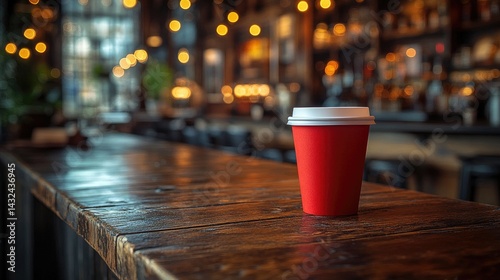 Red disposable coffee cup on a wooden bar counter in a cafe