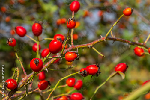 Red dog rose berries in autumn season. Many Red rosehip fruits and green leaves in sunny day