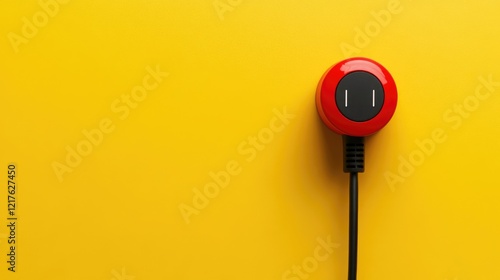 Red electrical plug with black button on a vibrant yellow background with ample copy space for text placement.