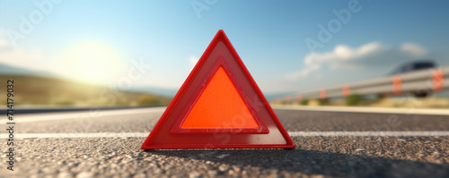 Red emergency safety triangle or stop sign on road.