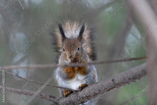 Red eurasian squirrel on snow in the park, close-up. Winter time.