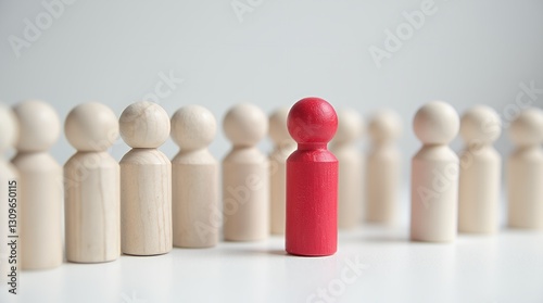 Red Figure Standing Out: A vibrant red figure stands out from a crowd of neutral wooden figures, symbolizing uniqueness, leadership, and standing out from the crowd